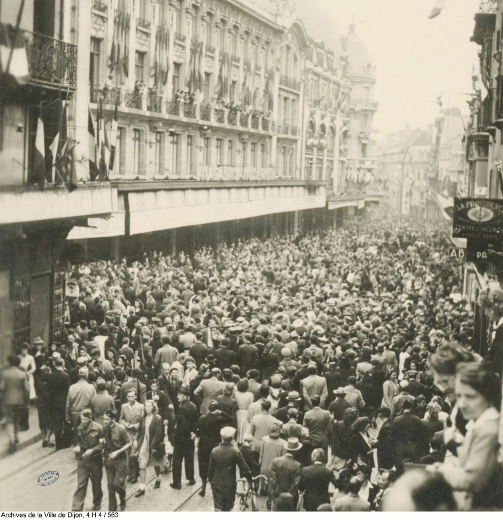 Un calme inhabituel régnait sur Dijon et envahissait ma chambre dont j’avais laissé la fenêtre ouverte en ce jour de fin d’été. Dans la petite arrière-cour de l’immeuble, le soleil radieux de septembre jetait des taches colorées sur le bois grisé des planches posées contre un mur dont il égayait un peu la morosité terne. C’était comme si, en ce matin lumineux tout n’était plus que paix dans un monde en guerre. Je me levai tôt et partis en catimini pour voir ce qui se passait. Les nouvelles des jours précédents nous autorisaient à présumer un départ imminent des Boches. Depuis plusieurs jours déjà, on savait qu’ils préparaient leur retraite, que des unités alliées arrivaient de l’ouest et du sud, et la quiétude de ce matin était sans doute révélatrice de cet événement fiévreusement attendu. Je pris la direction de l’emplacement qu’on appelle la Fontaine de Suisses, car jadis depuis ce promontoire, des troupes suisses avaient bombardé Dijon. Il y avait là une belle vue panoramique sur l’ensemble de la ville dont j’espérais qu’elle me permettrait d’avoir une vision d’ensemble de la situation. Quelques Allemands avaient dû faire une halte à cet endroit car le sol était jonché de nombreux débris parmi lesquels se trouvait une petite plaque écrasée en forme d’écusson faite de métal grisâtre mais qui avait dû être dorée et sur laquelle figurait une sorte de carte surmontée d’un aigle à croix gammée avec une inscription énigmatique : « Krim ». Tout en me demandant ce que pouvait signifier ce mot, (s’agissait-il d’une récompense pour avoir commis un crime ?) je résolu de conserver ma trouvaille en guise de trophée et la glissai dans ma poche de culotte courte. Aucun bruit de bataille. La ville était envahie par un silence assourdissant. On se serait cru un dimanche matin d’hiver. Seule une longue fumerolle noirâtre montait de l’embouchure de la vallée de l’Ouche témoignait d’un incendie récent ; ses volutes irrégulières barraient le bleu profond à l’ouest. Je résolus donc de redescendre par la place du 30 octobre, haut lieu de la défense de Dijon lors d’une autre guerre franco-allemande, au milieu de laquelle l’allégorie de Paul Cabet, juchée sur son grand piédestal de pierre blanchâtre, semblait vouloir se lancer à la poursuite des ennemis en déroute. Je regagnai la maison de mes parents où j’étais attendu avec quelque inquiétude. Après les remontrances d’usage on me fit asseoir pour prendre un frugal petit déjeuner accompagné d’une chicorée. Je dus rester enfermé jusqu’en milieu de matinée car mes parents pensaient, non sans raison, que la situation était incertaine. Mon père sortit le premier arborant un brassard FFI que je ne lui avais jusqu’alors jamais vu porter et confectionné à la hâte par son groupe sur un morceau de rayonne blanche. Vers neuf heures et demie, les habitants se sentant plus en sécurité commencèrent à sortir massivement et la nouvelle de l’arrivée de soldats, des Français, se répandit bientôt comme une trainée de poudre et c’est une foule qui peu à peu se forma arrivant de tous les quartiers pour converger vers la place Darcy et la rue de la Liberté, l’artère principale du centre-ville. Empruntés qu’avaient martelés les bottes cloutées des boches étaient empruntés par les véhicules américains frappés d’étoiles blanches qui équipaient les forces françaises victorieuses. La liesse était partout, et il est aujourd’hui bien difficile de décrire le sentiment de joie qui animait les cœurs. Les jeunes filles couraient vers les soldats et embrassaient sans retenue des inconnus, des mères tendaient leurs bambins pour qu’ils grimpent sur les blindés, des hommes pleuraient de joie. Je me faufilai au milieu de cette foule pour contempler ces compatriotes dont les uniformes étaient si différents de ceux de 1940 dont j’avais conservé un vague mais amère souvenir. Le soleil radieux illuminait la scène et renforçait encore son côté merveilleux. Pourtant j’appris que l’explosion que nous avions entendue dans la nuit était due au dynamitage de la gare de Dijon-ville par l’occupant en fuite. Le majestueux édifice s’était, disait-on, en partie écroulée sur lui-même. Curieux, je résolus d’aller voir ce spectacle et remontai en courant la cohue qui, par endroit, ne laissait qu’un étroit couloir aux automitrailleuses et aux half-tracks. Sans trop savoir ce dont il pouvait s’agir, je glanai au passage quelques chewing-gums que des soldats lançaient, et chemin faisant, je goûtai l’un de ces curieux mais délicieux bonbons dont ma mastication n’arrivait pas à bout et je dus me résoudre à le recracher… Arrivé enfin sur place, je contemplai, médusé le spectacle de désolation qui s’offrait à moi scrutant avec des yeux ronds ce paysage surréaliste. L’immense marquise qui surplombait les quais s’était affaissée sur les voies et ressemblait à une gigantesque baleine de fonte et de verre échouée derrière le modeste bâtiment de pierre qui, jusque-là, marquait l’entrée de la gare. Un sentiment de révolte s’empara de moi. C’était la première fois que je voyais des destructions de si près. Bien sûr, il y avait eu quelques bombardements pendant ces années noires, mais jamais un bâtiment si gros et que je connaissais si bien n’avait été endommagé de la sorte. La détestation des occupants, jusque-là plus un mot qu’une réalité prit alors un tour concret marqué dans la pierre au milieu de ce tas de gravats. Les personnes présentent maudissaient ces étrangers qui, d’ailleurs ne s’étaient pas contentés de ce saccage et s’étaient livrés à d’autres destructions, vaines tentatives pour enrayer la marche victorieuse de notre armée. La matinée s’achevait et je me décidai à rentrer chez moi. Il me sembla plus simple de contourner